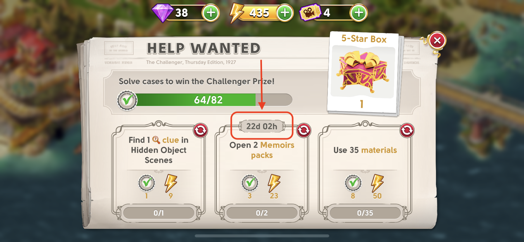 To complete this case, you need to either earn or purchase one or more Memoirs packs depending on the case requirement. You can collect packs by earning them from Hidden Object Scenes or time-limited events, or by purchasing them from the Pack Shop or Special Offers.