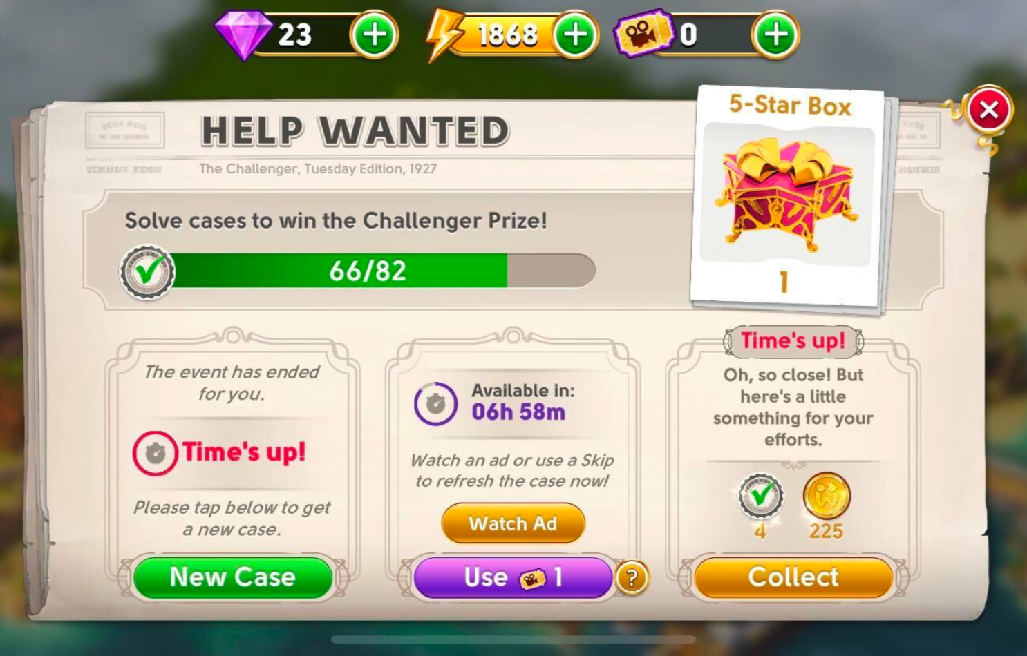 - If you didn’t make enough progress before the time’s up, you will not receive a reward, and you can move on to the next case for free.