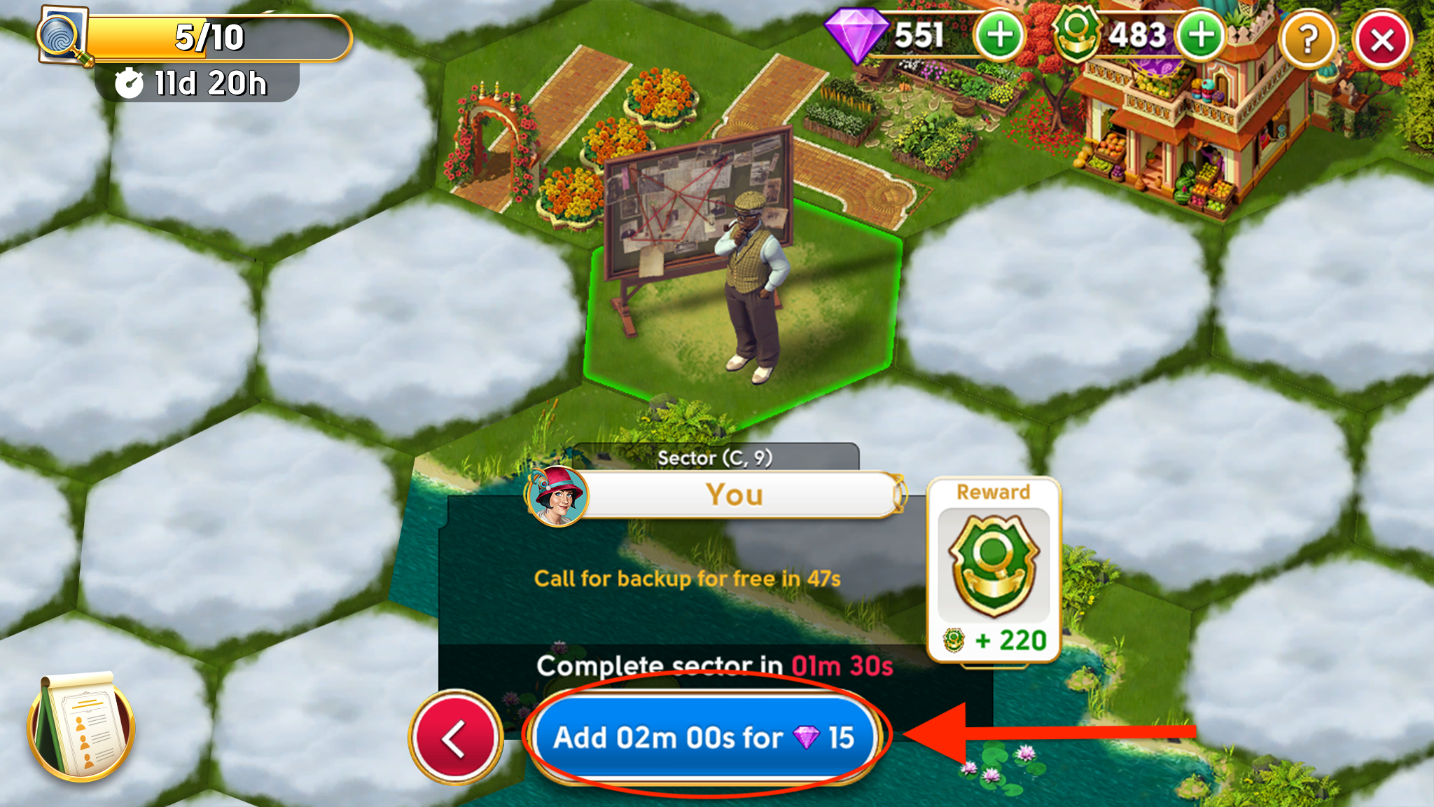 All you have to do is tap the timer button with the plus sign on the right side of your sector menu, and then tap the Call for Backup button. Every Detective in your club will receive your call and has the option to send you some additional time for free, which will then be added to your sector timer.
