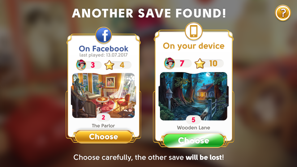 IMPORTANT: If you do ever decide to un-sync your mobile version of the game from Facebook, you will have to start the game again on your device from the beginning, as if you've never played before. If you have played June’s Journey on your mobile device and a computer via Facebook before, you will now be choosing to only continue with ONE of those games. The other one will be deleted and cannot be retrieved once you sync your game.
