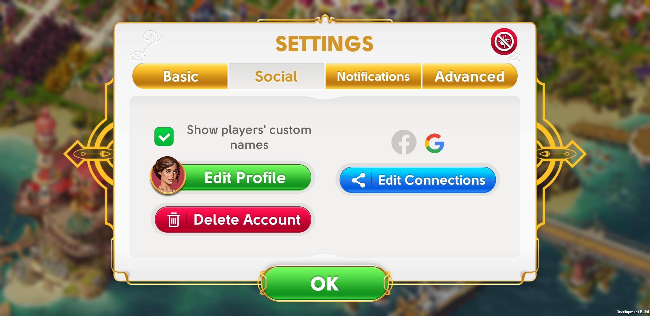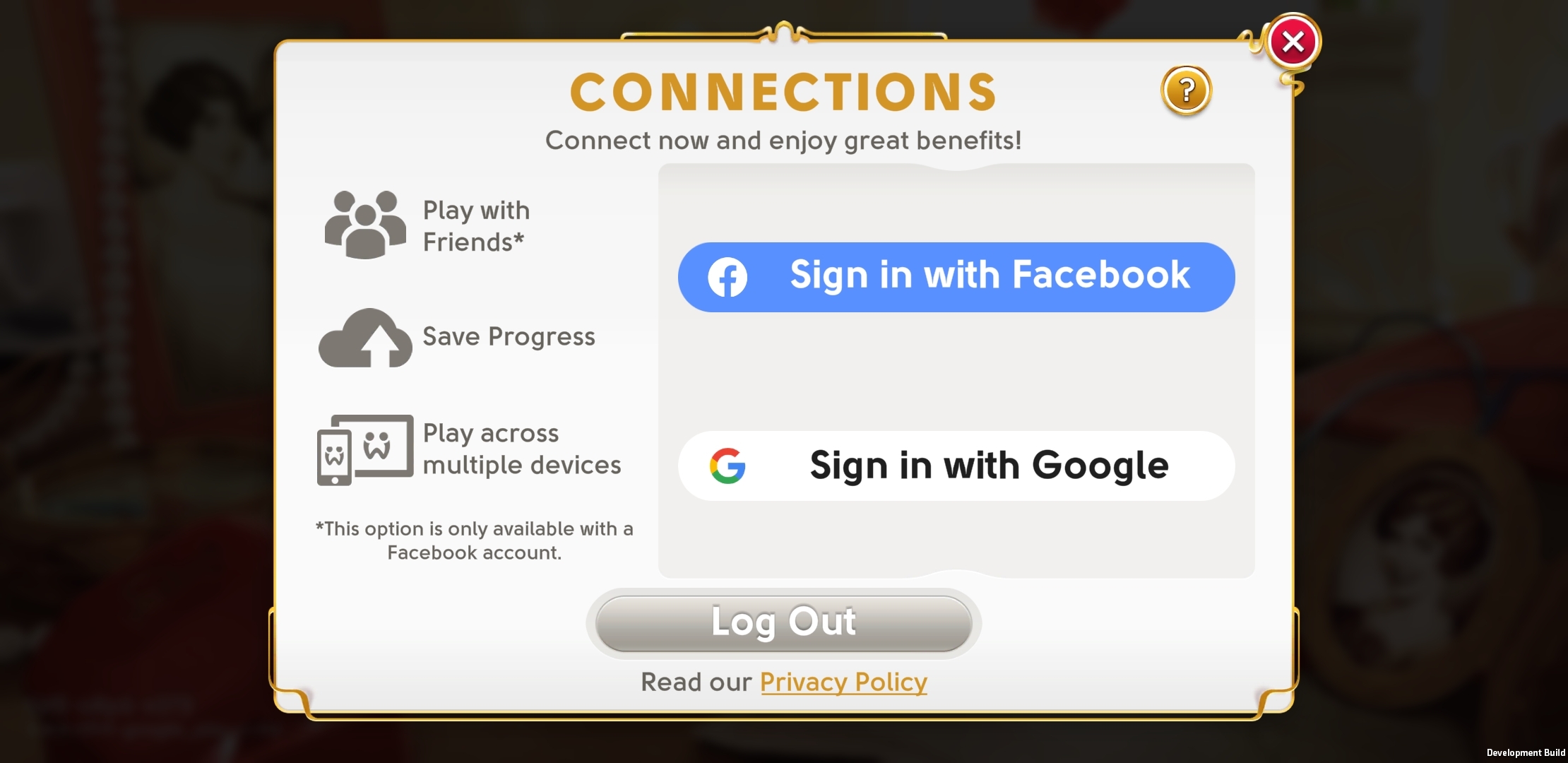 If you wish to keep both June’s Journey accounts on the same device, and you are either connected with Facebook or with your Google ID, you can use the ‘Connections’ functionality under the ‘Edit Connections’ section of the Social menu.