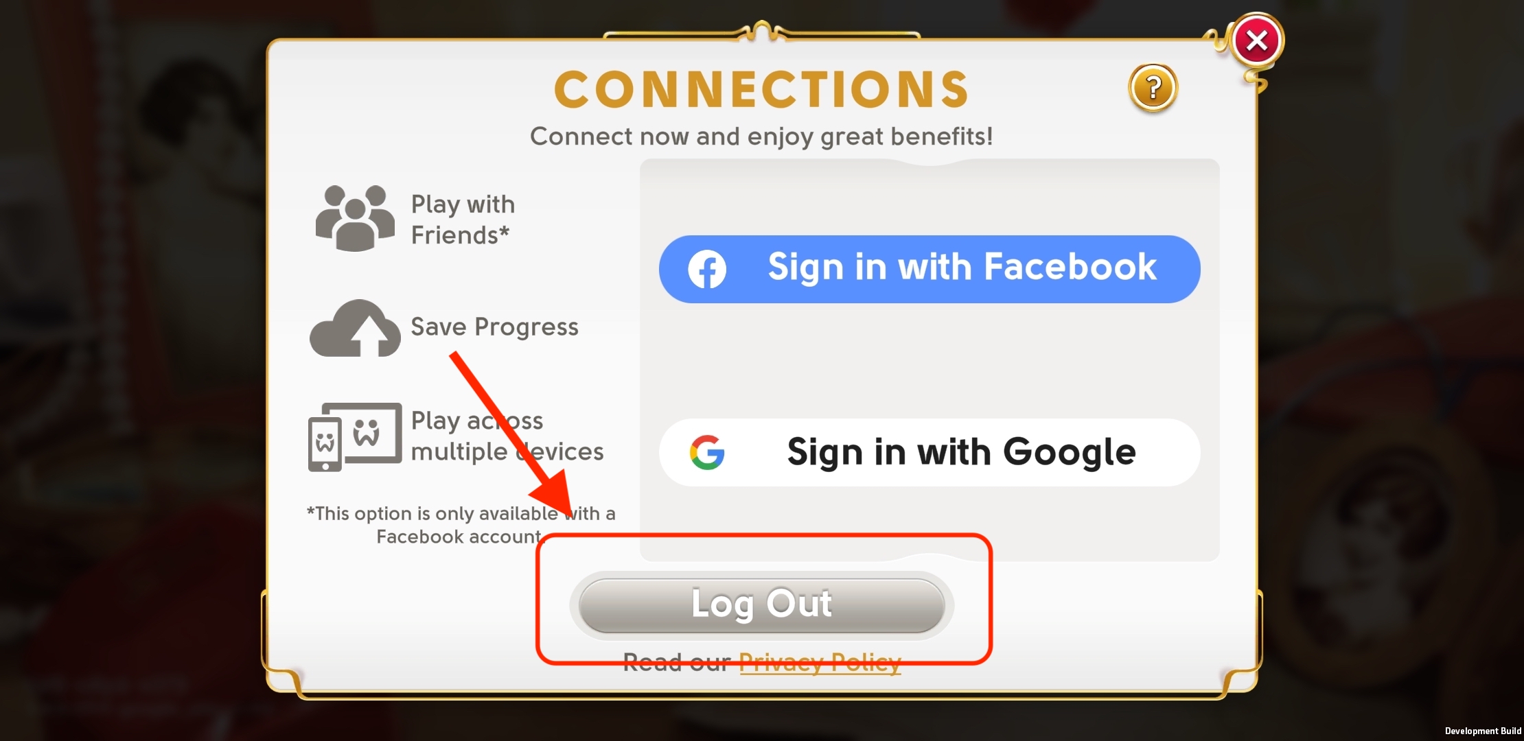 If you tap the Log Out button on the ‘Connections’ pop-up, you will be logged out and your game will no longer be connected to your Google ID.