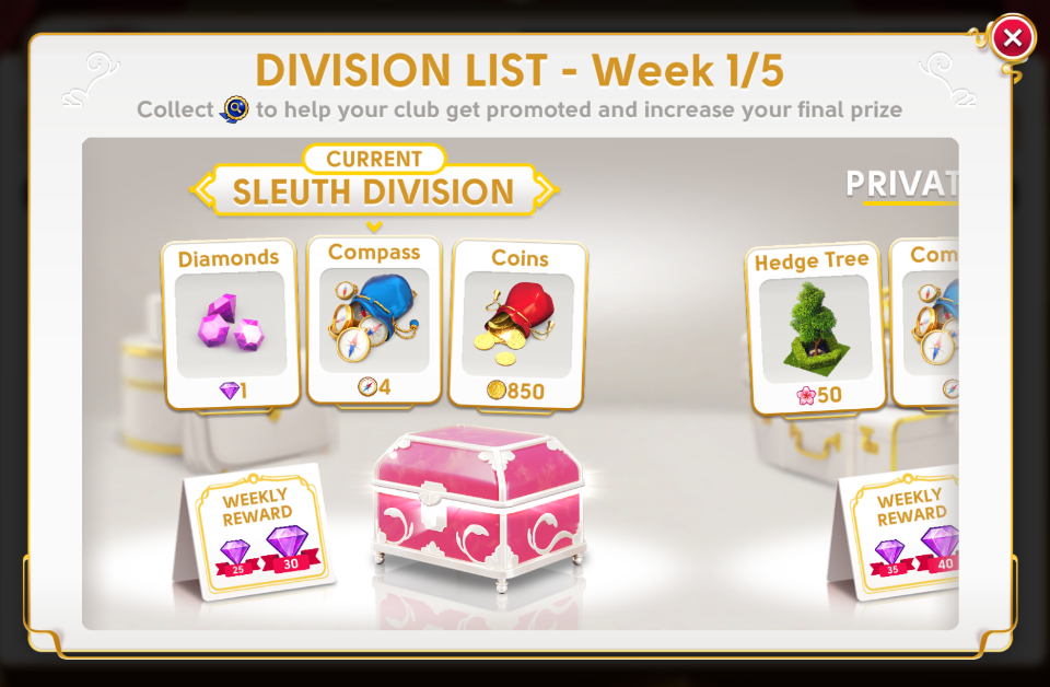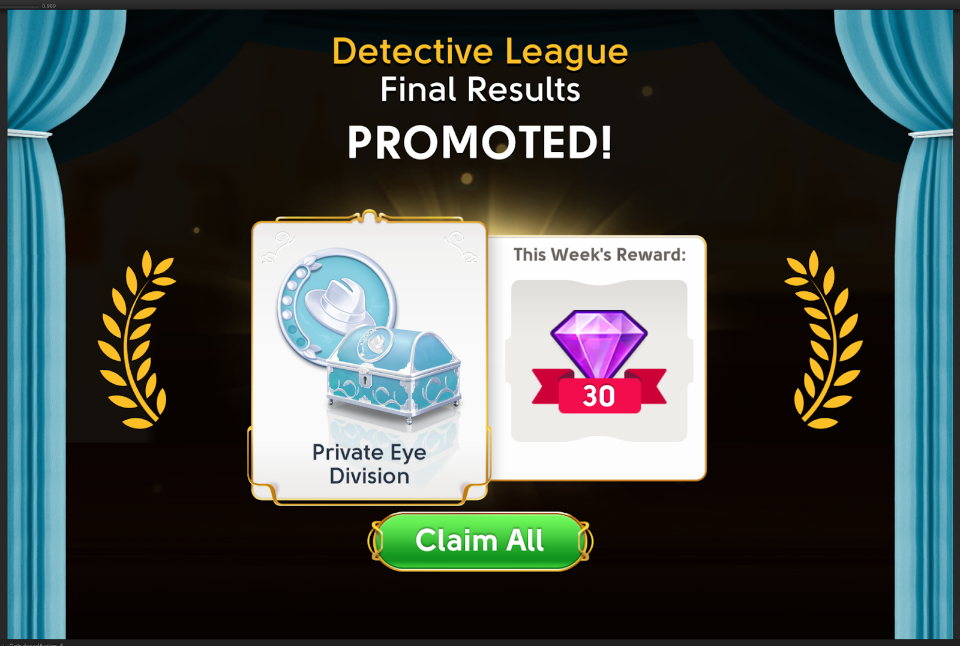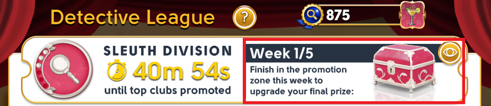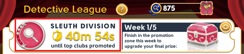 The Weekly reward can be claimed up to one week after the Tournament finishes, and the League reward up to one week after the Detective League ends. You can check which rewards are available in each Division by tapping the Eye icon above the Leagues screen.