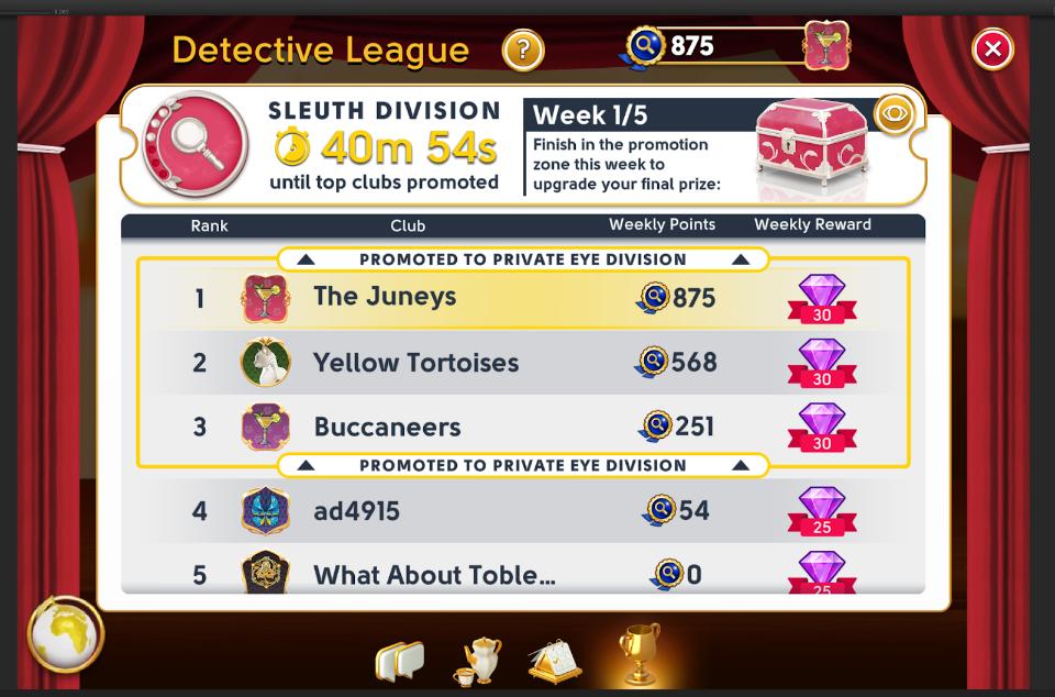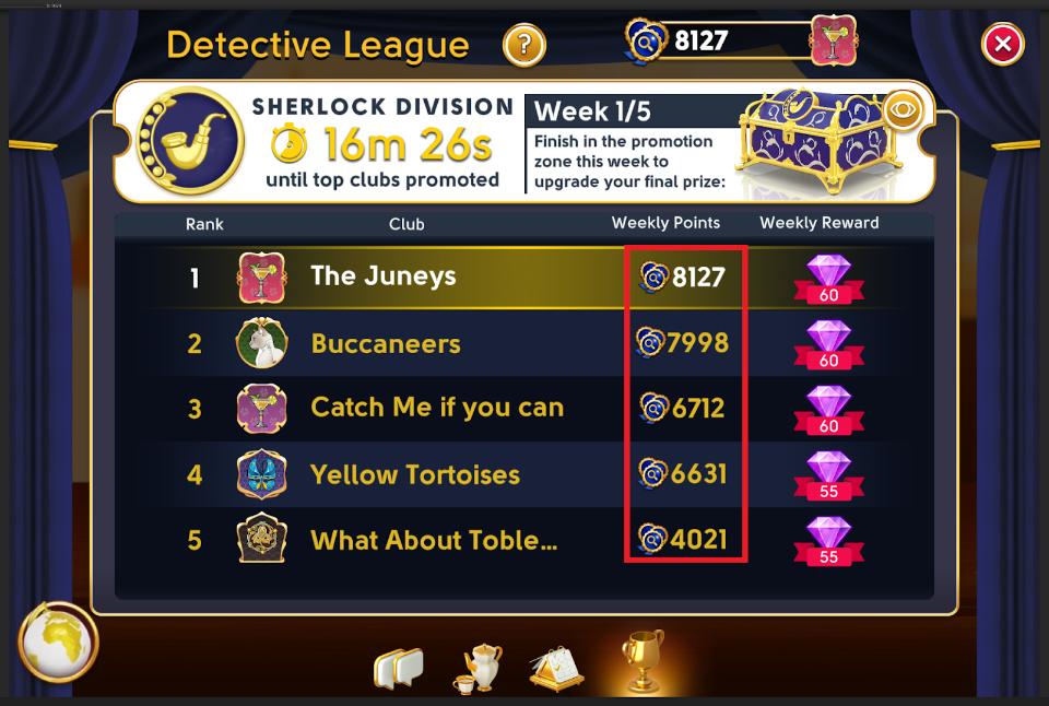 The highest Division for a master detective is Sherlock which has top tier exclusive rewards! Upon reaching Sherlock division your club’s banked points are unlocked and become part of your club’s Total points. Clubs in Sherlock division are ranked by the amount of Total points they have earned.