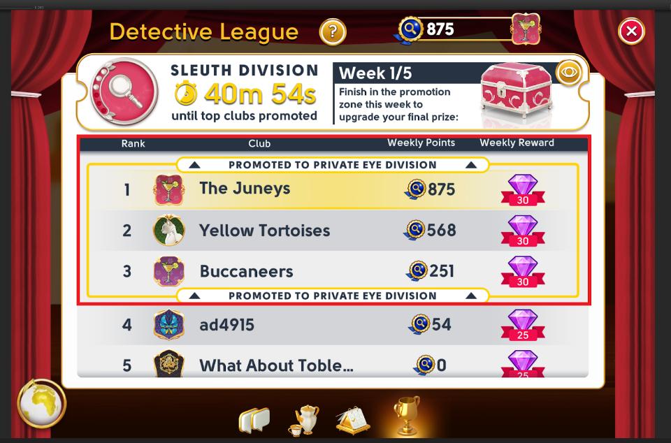 Divisions are the coveted ranks that you can climb at the end of each tournament. Each division has its own exclusive rewards which get better the higher your club progresses! Each club starts in the entry division of Rookie and can progress to Inspector, Sleuth, Private Eye, Ace, and ultimately Sherlock.