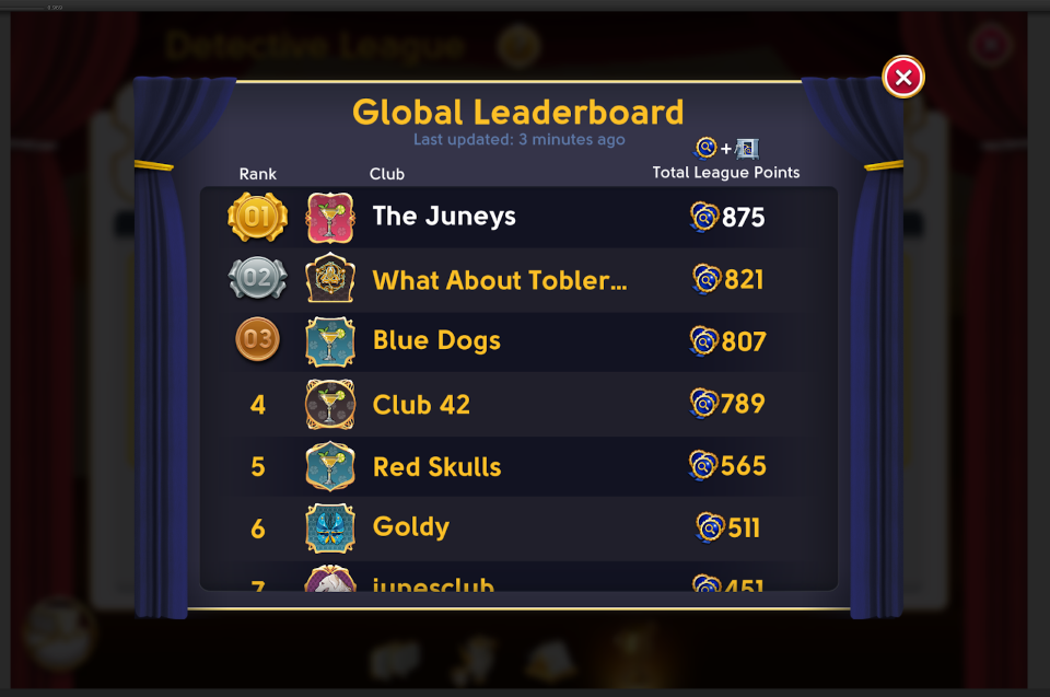 Curious to see how your club stacked up against other detectives around the world? You can take a peek at the list of the best scoring clubs by Total League Points anytime during an active League at the Global Leaderboard. Simply tap the Globe icon found to the left of the League screen.