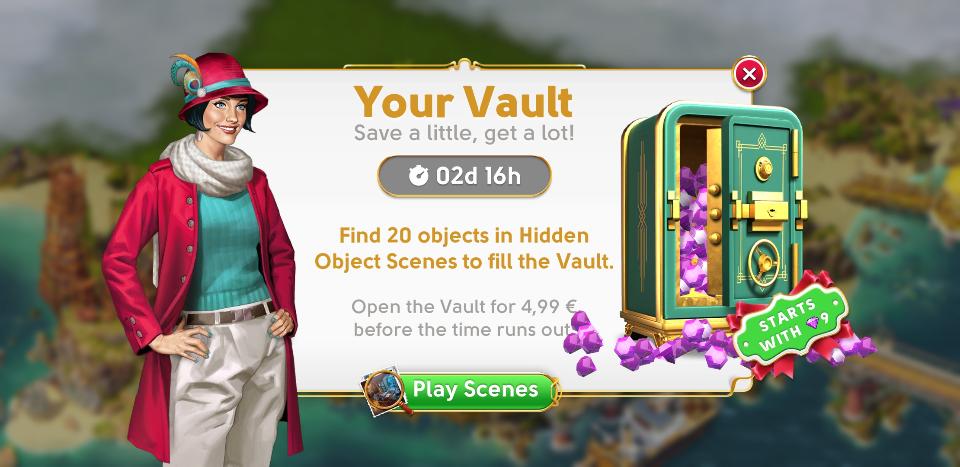During the Vault event you will complete tasks by playing Hidden Object Scenes to earn some additional rewards. Every time a task is completed, you will receive your normal reward at the end of each round in addition to a Vault reward which will be stored in the Vault.