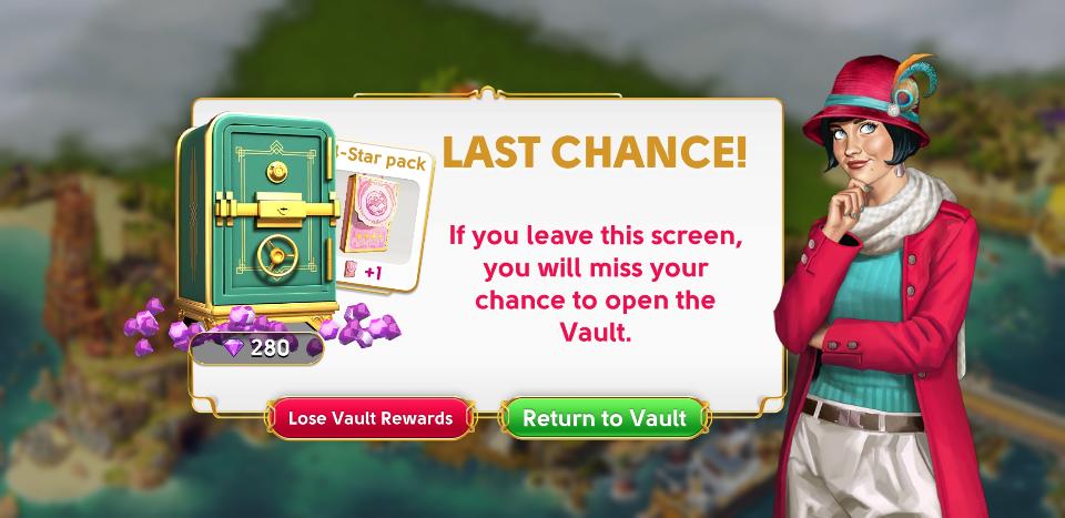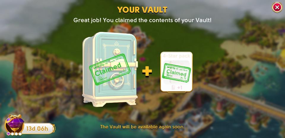 It’s your decision if you want to get those nice rewards right away or continue adding to the Vault until it is full. Just remember to check how much time you have left on the Vault timer every once in a while.