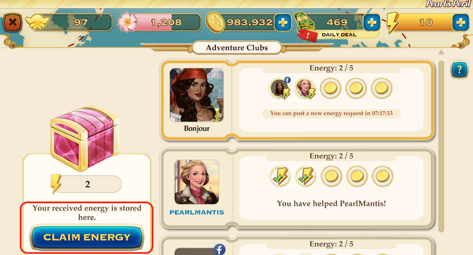 - You cannot claim energy if you have no energy in your pink Energy Chest.