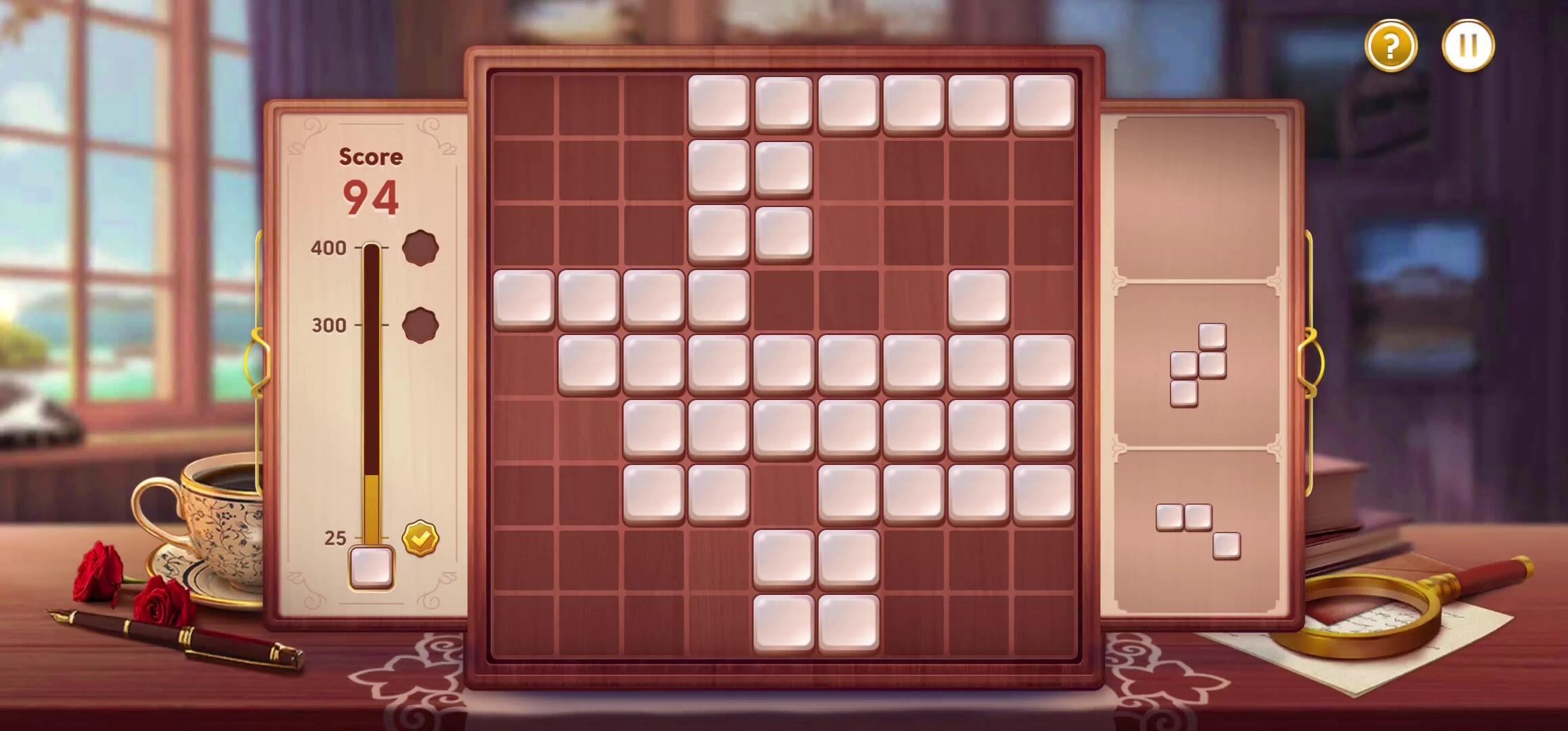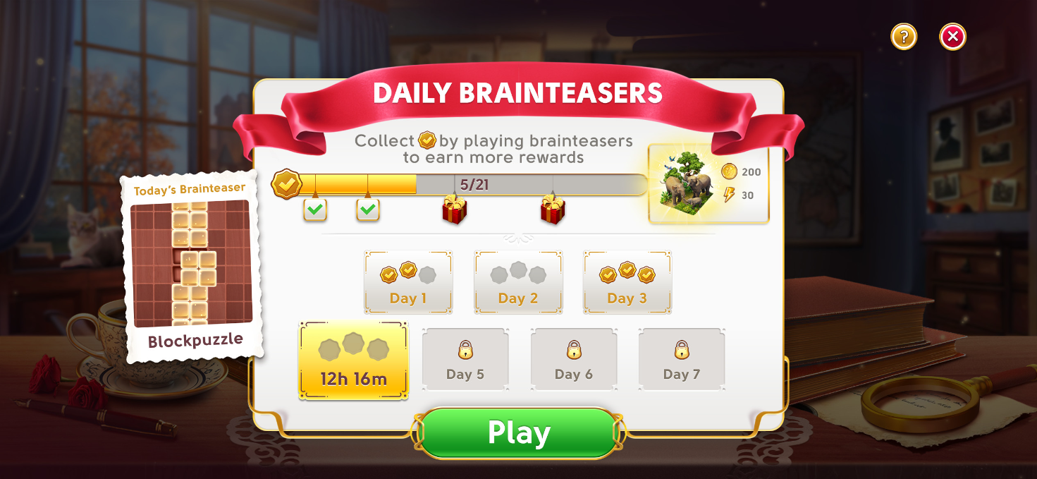 Una vez que hayas desbloqueado la Cabaña del Detective, te estará esperando un nuevo puzle de bloques cada día. La primera ronda de cada nuevo puzle es gratuita. Si no alcanzas los tres objetivos de puntos, puedes repetir el puzle por un coste. Cuando consigas los tres puntos de un puzle, habrás terminado por ese día.
