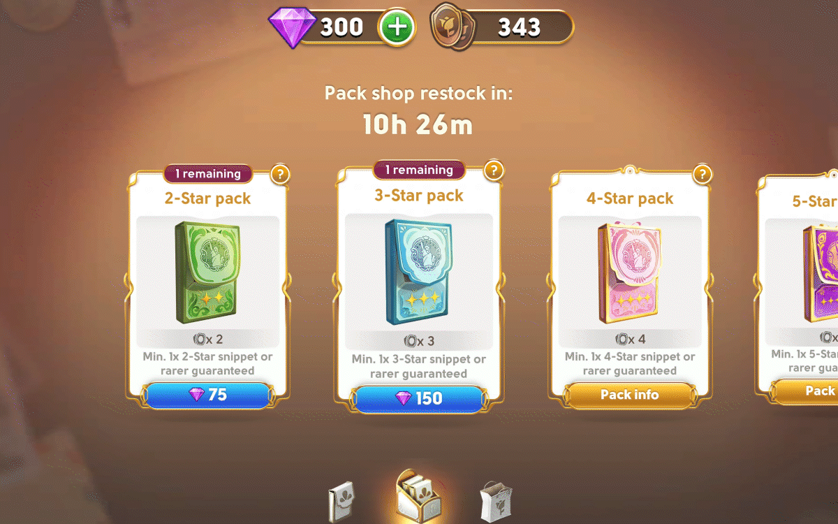 Los paquetes son pequeños contenedores de recuerdos que albergan fragmentos necesarios para completar álbumes. ¡Los paquetes presentan diferentes niveles! Los paquetes de niveles superiores pueden contener más fragmentos. Además, las estrellas del paquete muestran la rareza mínima garantizada de uno de los fragmentos de ese paquete. Por ejemplo, en un paquete de 3 estrellas habrá seguro un fragmento con una rareza de 3 estrellas o más. La rareza de un paquete también afecta a la rareza mínima de un fragmento en él. Por ejemplo, un paquete con una rareza de tres estrellas contiene seguro un fragmento de tres estrellas.