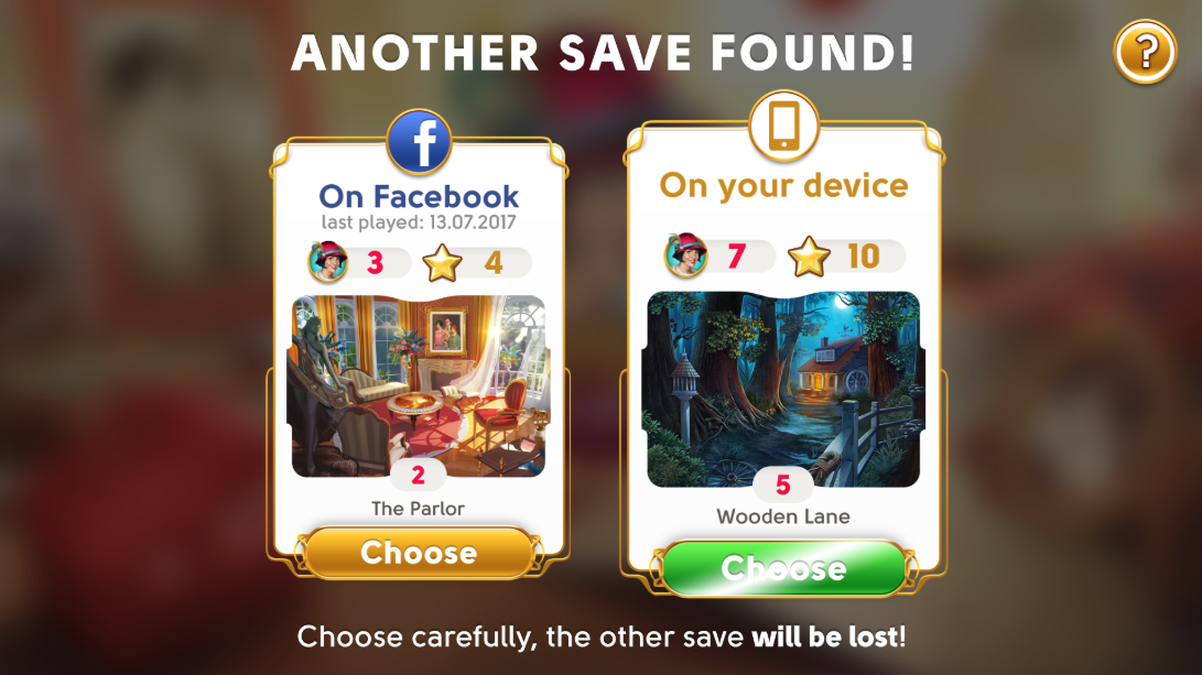 Ad esempio, se hai giocato a June's Journey su dispositivo mobile e su computer tramite Facebook, ora dovrai scegliere di continuare con una sola di queste partite. L'altra verrà cancellata e non potrà essere recuperata una volta sincronizzata la tua partita.