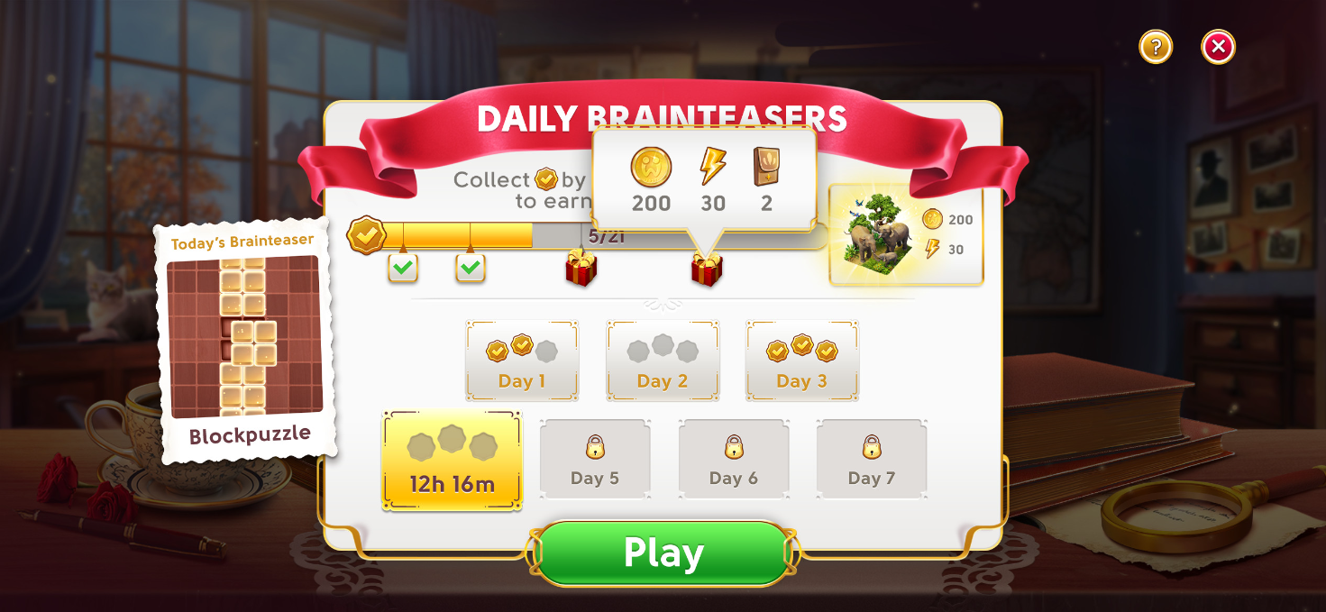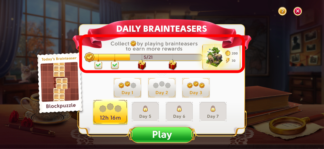 Un rompicapo intrigante è tutto ciò di cui ha bisogno June per allenare la sua mente al lavoro di detective che l'aspetta! Una volta sbloccata la Baita del Detective, avrai a disposizione una nuova partita di Blocchi rompicapo che ti attende ogni giorno. Quando avrai raggiunto tutti e tre i traguardi di punteggio, avrai completato i Blocchi rompicapo del giorno. Potrai rigiocare a una nuova partita di Blocchi rompicapo il giorno successivo. Nel frattempo, puoi divertirti con le altre attività offerte da June's Journey!